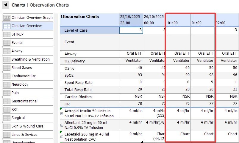 Please record observations and fluid balance for both 1:00–2:00 AM hours.